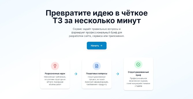 Создаёт готовое техническое задание (ТЗ) для вашего проекта — профессиональное и структурированное. Просто отвечайте на вопросы о идее, и сервис соберёт всё: описание, аудиторию, MVP-функции, риски и рекомендации. Экономьте время на общении с разработчиками!