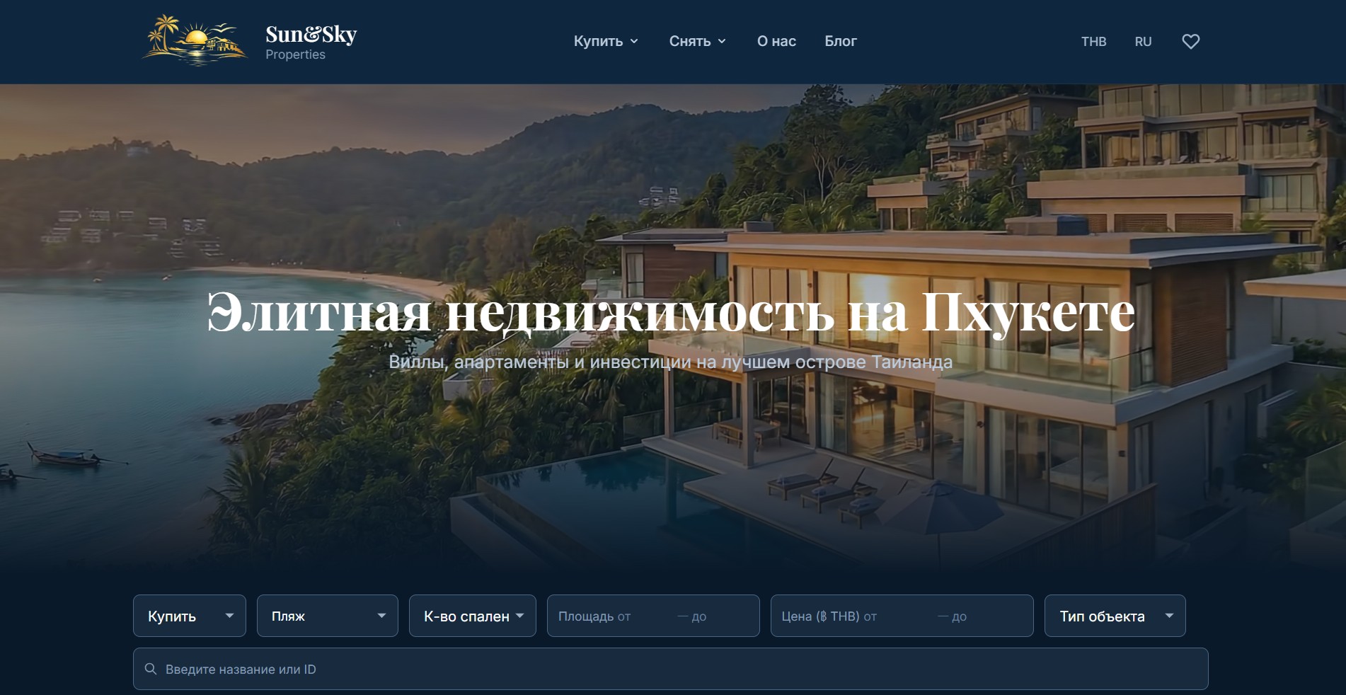 Сайт элитной недвижимости на Пхукете: виллы, апартаменты, таунхаусы, пентхаусы и земельные участки. Каталог с фильтрами по типу объекта, количеству спален, площади и цене. Разделы «Купить» и «Снять», карта объектов и форма обратной связи для подбора вариантов.