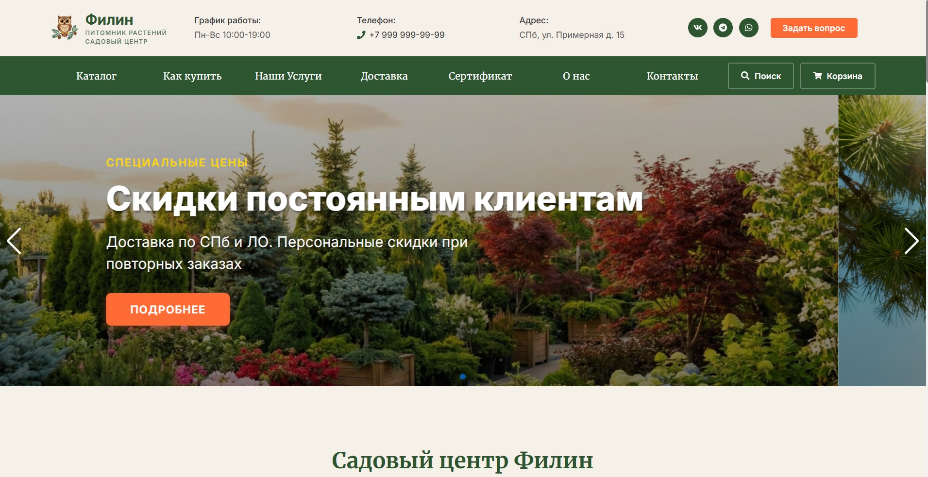 Сайт садового центра и питомника растений: каталог хвойных, лиственных и плодовых деревьев и кустарников, доставка и профессиональная посадка с гарантией приживаемости. Скидки постоянным клиентам, подарочные сертификаты, контакты и форма обратной связи.