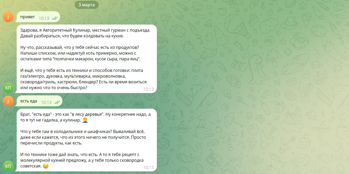 Telegram-бот, который на основе имеющихся ингредиентов придумывает рецепты, добавляет юмор и поднимает настроение пользователю.